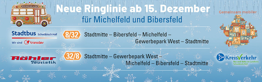 Ab 06:17 Uhr im Stundentakt bis 19:17 Uhr fahren wir Montags bis Freitags ab Schwäbisch Hall ZOB über Gewerbepark West – Michelfeld – Bibersfeld – SZW wieder zum ZOB.